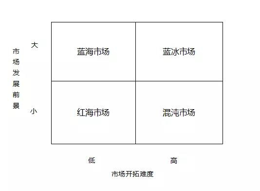 我們可以從市場開拓難度和市場發展前景兩個維度分析不同類型的市場。混沌市場的發展路徑不連續,開拓難度高,未來方向不確定,發展前景小;紅海市場已經相當成熟,開拓難度最低,市場競爭激烈,發展前景小;藍海市場相對藍冰市場而言,開發難度較低,藍海市場和藍冰市場同樣市場前景較大。