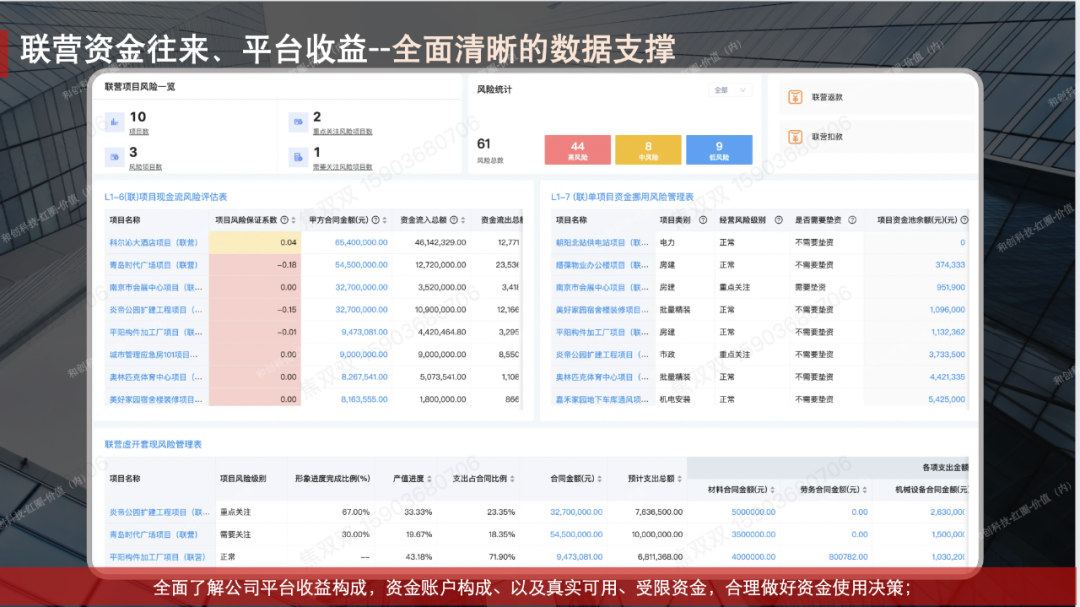 當(dāng)前公司數(shù)字化程度較低,通過(guò)簡(jiǎn)單的oa軟件、Excel表格、微信群、例會(huì)等傳統(tǒng)的管理方式進(jìn)行管理。近幾年隨著公司省外業(yè)務(wù)的拓展,項(xiàng)目越來(lái)越大,傳統(tǒng)的低效管理模式已經(jīng)無(wú)法滿足日常的管理需求。公司聯(lián)營(yíng)項(xiàng)目較多,個(gè)別項(xiàng)目出現(xiàn)資金挪用,虛開(kāi)套現(xiàn),造成不必要的法律訴訟官司,甚至資金賬戶被凍結(jié)。此外,公司自營(yíng)項(xiàng)目,人材機(jī)等各項(xiàng)成本,當(dāng)前人工進(jìn)行把控,項(xiàng)目利潤(rùn)不達(dá)預(yù)期;人工進(jìn)行統(tǒng)計(jì),需要扒賬,實(shí)效性差,財(cái)務(wù)報(bào)表不能實(shí)時(shí)動(dòng)態(tài)呈現(xiàn)。