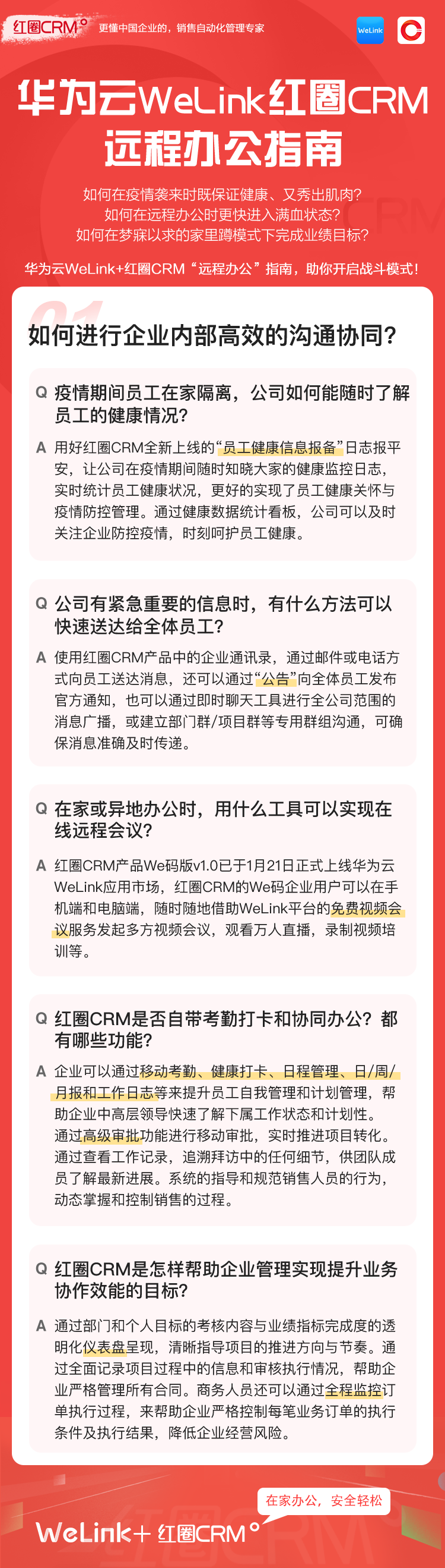 如何讓在家辦公安全、輕松、高效?華為云WeLink攜手紅圈CRM提供了安全、智能、開放的移動辦公解決方案,并提供免費的在線視頻會議服務(wù),請您收好這份遠程移動辦公寶典!