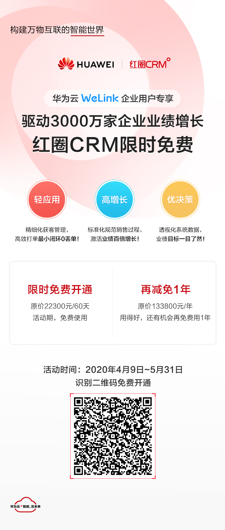驅動3000萬家企業業績百倍增長——紅圈CRM限時免費,#華為云WeLink#企業用戶專享,更有驚喜0元購活動。