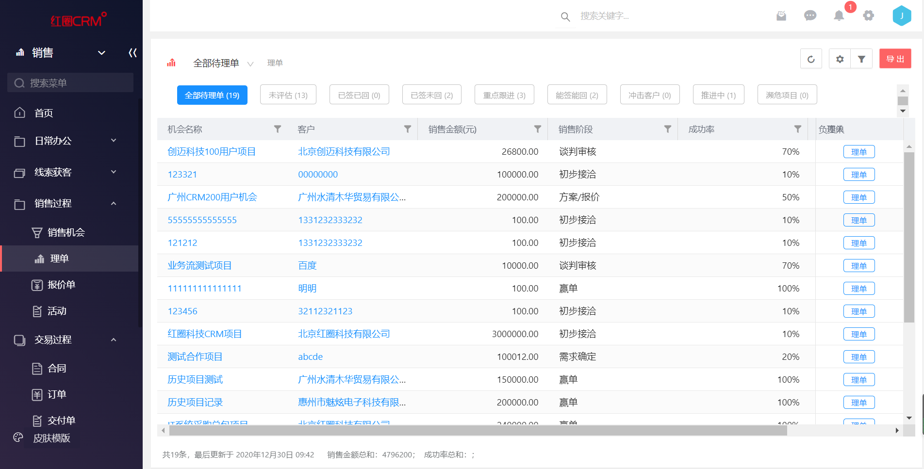 在銷售管理方面,2020 年紅圈 CRM 也有了長足的改進,新增了交付單和報價單管理,為實現 CPQ 奠定基礎。增加變更單,支持合同變更。新增找線索功能,幫助企業高效獲取銷售線索。還有優化改進理單和公海池等等。在銷售管理方面的不斷打磨演進,使紅圈 CRM 更好的服務于裝備制造行業。