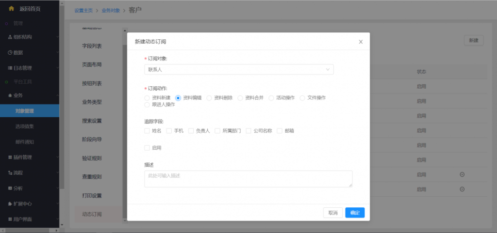 系統(tǒng)設(shè)置——業(yè)務(wù)——對象管理——動態(tài)訂閱——新建