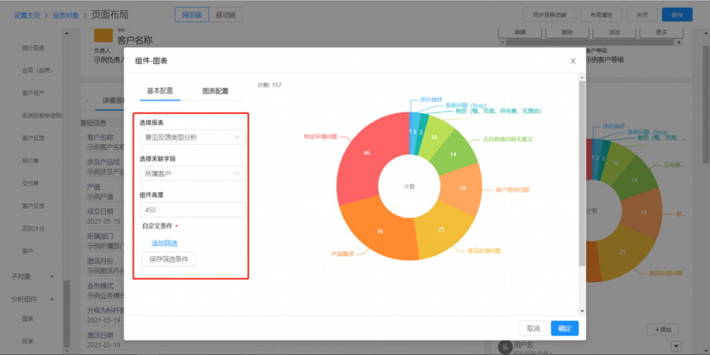 - 基本配置:選擇相關(guān)對象的報表,指定關(guān)聯(lián)字段,也可以配置篩選條件