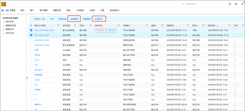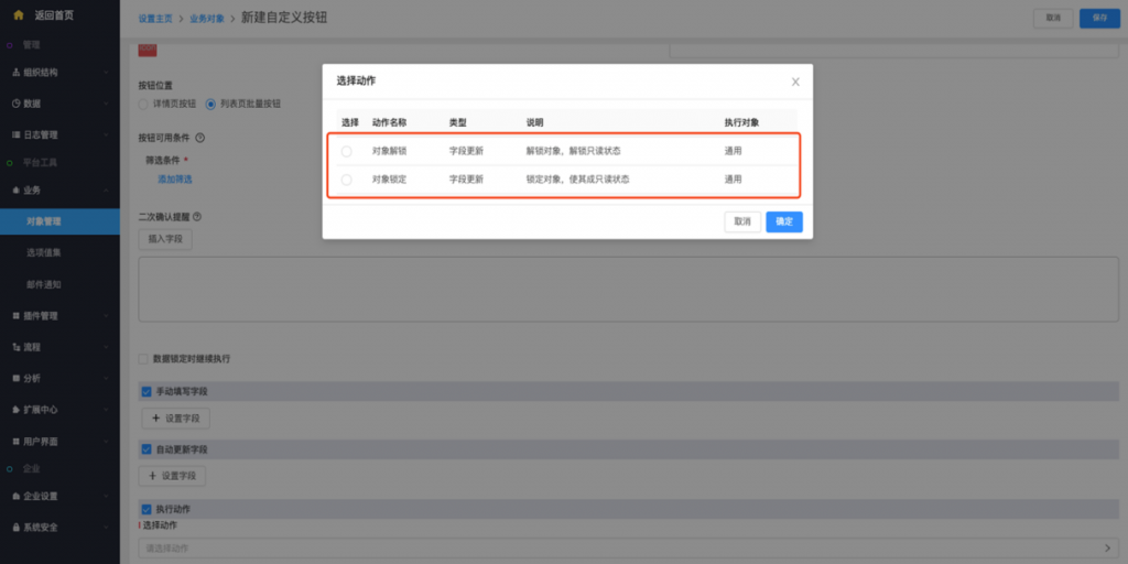 - 列表頁批量按鈕支持執(zhí)行鎖定和解鎖動作:列表頁批量按鈕支持執(zhí)行動作,可以執(zhí)行鎖定和解鎖動作,在前端實現(xiàn)批量鎖定和批量解鎖