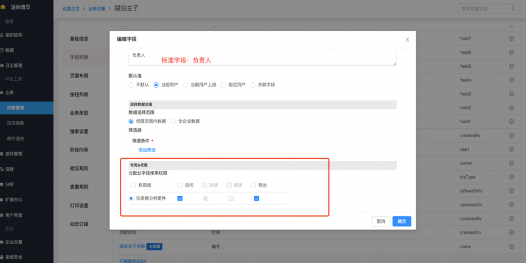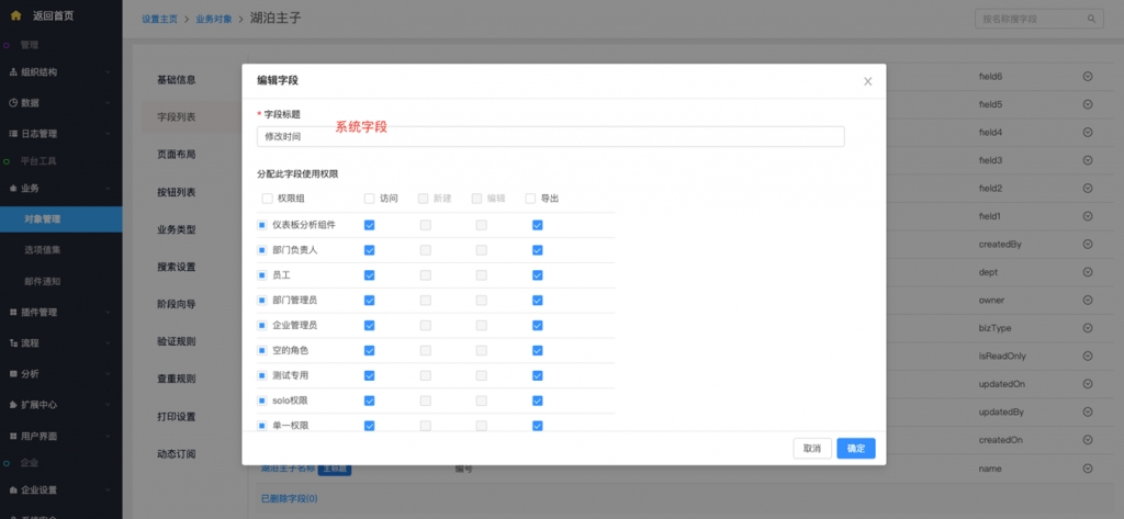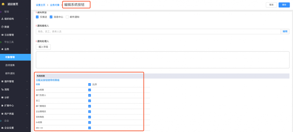- 系統(tǒng)字段及按鈕修改權(quán)限配置:系統(tǒng)字段、標(biāo)準(zhǔn)字段(所屬部門及負(fù)責(zé)人)、按鈕支持在編輯時修改權(quán)限