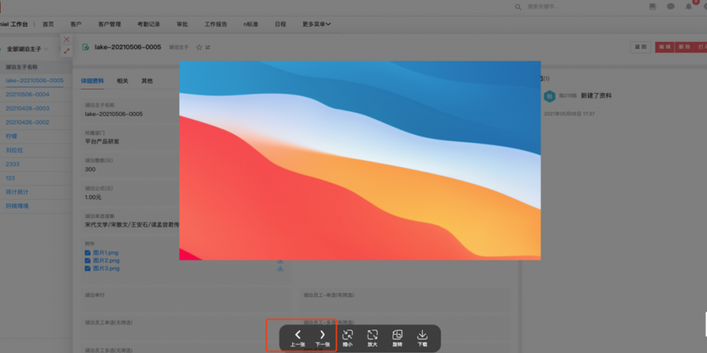 - 附件字段中的圖片預(yù)覽時可上下切換:附件字段中詳情頁的圖片在預(yù)覽時可以上下切換