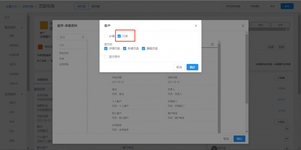 - 頁面布局字段可配置只讀:頁面布局-詳細(xì)資料組件中,字段可配置只讀屬性,在新建或編輯時,字段不可手動填寫,但默認(rèn)值可正常計算