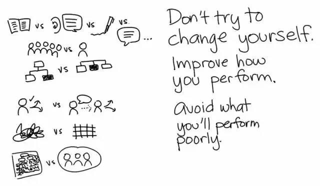 下面這個結論值得我們反復強調:不要試圖改變自我,因為這樣你不大可能成功。但是,你應該努力改進你的工作方式。另外,不要從事你干不了或干不好的工作。