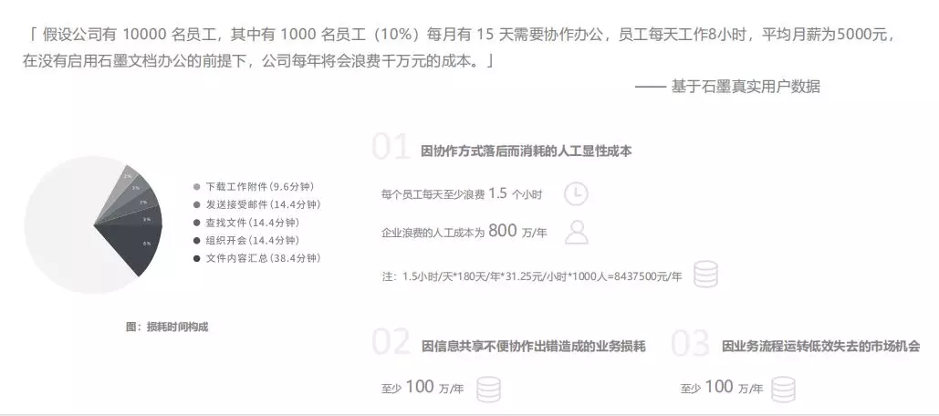 集腋成裘,員工每天花費在傳輸文件、查找文件、內(nèi)容匯總、文件傳輸上的時間并不是個小數(shù)目。對于一家10000 人規(guī)模的企業(yè)來說,每天至少要耗費 90 分鐘的無效時間,這直接導(dǎo)致企業(yè)每年需要付出將近 800 萬元的無效成本。