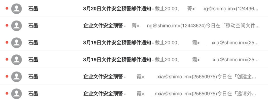 石墨文檔提供的「文件安全預(yù)警」功能,可以幫助企業(yè)實時監(jiān)控文件異常狀態(tài),短時間員工大量復(fù)制、導(dǎo)出企業(yè)文件等異常操作,企業(yè)會自動收到郵件通知,降低損失。