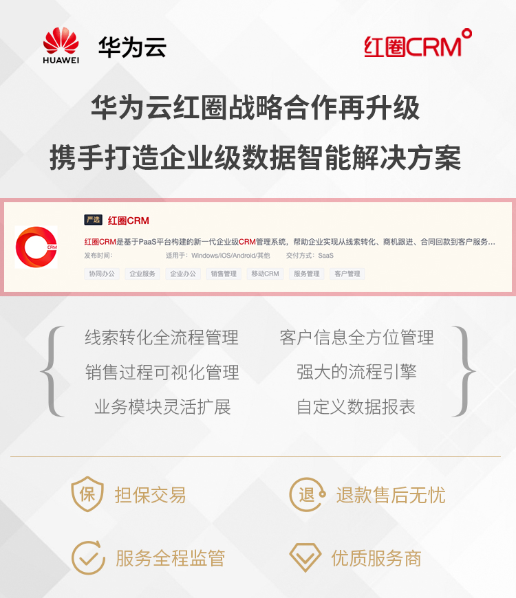日前,繼2019年作為首批加入華為云WeLink的生態(tài)伙伴和唯一CRM系統(tǒng)服務(wù)商后,紅圈與華為云戰(zhàn)略合作持續(xù)升級(jí),再次在華為云嚴(yán)選商城發(fā)布了紅圈 CRM企業(yè)級(jí)移動(dòng)銷(xiāo)售自動(dòng)化管理系統(tǒng)。旨在基于華為云整體公有云解決方案的基礎(chǔ)上,為中大型企業(yè)、集團(tuán)公司用戶(hù)提供更加優(yōu)質(zhì)的數(shù)據(jù)智能解決方案,幫助企業(yè)實(shí)現(xiàn)從線(xiàn)索轉(zhuǎn)化、商機(jī)跟進(jìn)、合同回款到客戶(hù)服務(wù)的LTC全流程精細(xì)化管理,提升企業(yè)競(jìng)爭(zhēng)力,推動(dòng)企業(yè)業(yè)績(jī)?cè)鲩L(zhǎng)。