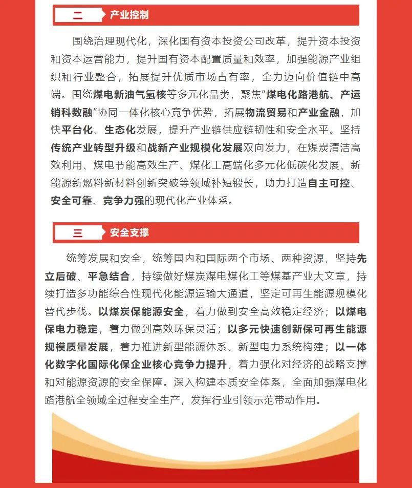 國(guó)家能源集團(tuán)最新確立了“一個(gè)目標(biāo)、三個(gè)作用、六個(gè)擔(dān)當(dāng)”發(fā)展戰(zhàn)略。一個(gè)目標(biāo)是指“全面建設(shè)世界一流清潔低碳能源科技領(lǐng)軍企業(yè)和一流國(guó)有資本投資公司”,三個(gè)作用是指發(fā)揮科技創(chuàng)新、產(chǎn)業(yè)控制、安全支撐作用,六個(gè)擔(dān)當(dāng)是指擔(dān)當(dāng)能源基石、擔(dān)當(dāng)轉(zhuǎn)型主力、擔(dān)當(dāng)創(chuàng)新先鋒、擔(dān)當(dāng)經(jīng)濟(jì)標(biāo)兵、擔(dān)當(dāng)改革中堅(jiān)、擔(dān)當(dāng)黨建示范。