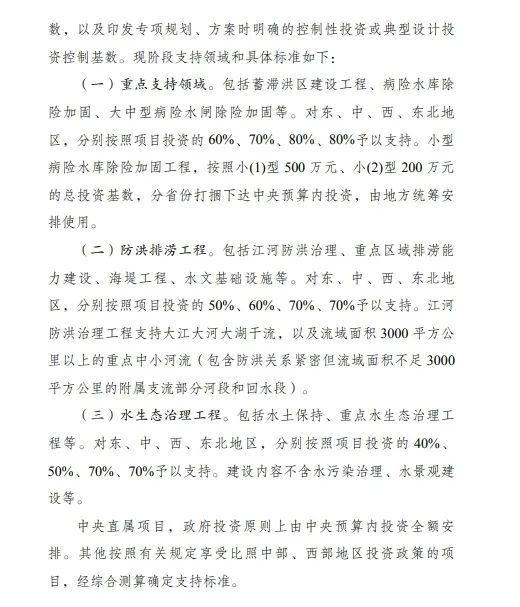 防洪排澇工程。包括江河防洪治理、重點區域排澇能力建設、海堤工程、水文基礎設施等。對東、中、西、東北地區,分別按照項目投資的50%、60%、70%、70%予以支持。江河防洪治理工程支持大江大河大湖干流,以及流域面積3000平方公里以上的重點中小河流(包含防洪關系緊密但流域面積不足3000平方公里的附屬支流部分河段和回水段)。