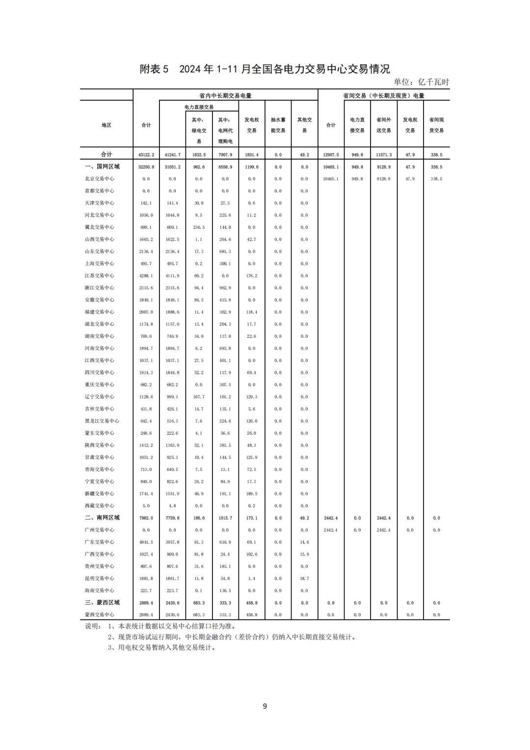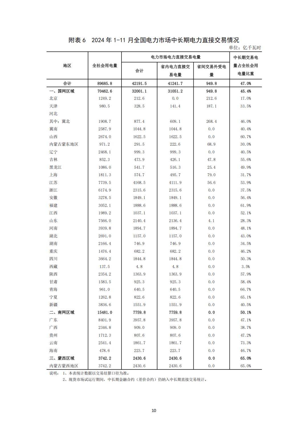 全國電力市場中長期電力直接交易中,1-11月,全國電力市場中長期電力直接交易電量合計為42191.5億千瓦時,同比增長5.7%。其中,省內電力直接交易(含綠電、電網代購)電量合計為41241.7億千瓦時,省間電力直接交易(外受)電量合計為949.8億千瓦時。