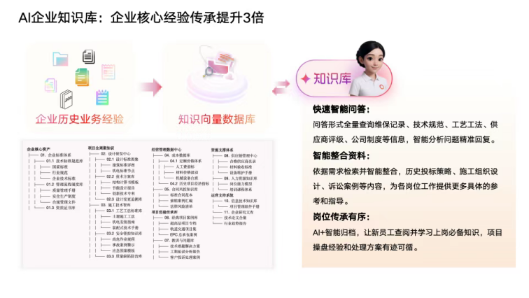新員工遇到 “軟土地基怎么處理”“工期延誤如何協(xié)調(diào)” 這類問題,不用再到處找老師傅請教 —— 只需在知識(shí)庫中輸入問題,3 秒內(nèi)就能獲得經(jīng)過驗(yàn)證的解決方案。這個(gè)知識(shí)庫整合了企業(yè)的技術(shù)規(guī)范、優(yōu)秀施工方案、事故案例等所有核心資料,形成了一個(gè) “統(tǒng)一的知識(shí)中樞”。它把傳統(tǒng) “師帶徒” 的模式,升級(jí)成了可規(guī)模復(fù)制的數(shù)字化賦能平臺(tái),新人培養(yǎng)效率大幅提升,完美解決了 “核心技術(shù)依賴專家” 的困境。