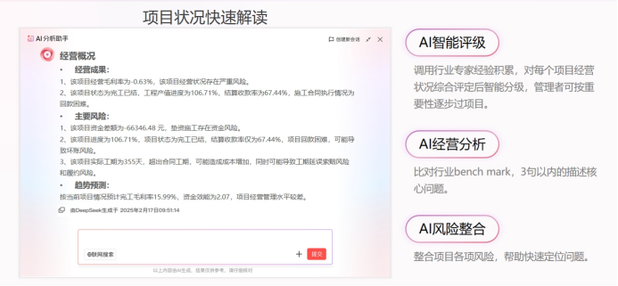 紅圈AI系列智能產(chǎn)品中的項目360°AI解讀,通過整合全維經(jīng)營指標,一鍵生成項目全景作戰(zhàn)圖,讓復(fù)雜數(shù)據(jù)轉(zhuǎn)化為清晰決策語言。該功能能夠?qū)椖拷?jīng)營狀況進行智能評級,并整合各項風(fēng)險,幫助管理者快速定位問題。通過結(jié)構(gòu)化呈現(xiàn)項目關(guān)鍵信息、收支分析、資金分析和成本構(gòu)成等數(shù)據(jù),項目360°AI解讀使項目進度監(jiān)控更加精準高效。這種透明化的進度跟蹤,不僅提高了項目執(zhí)行效率,也降低了因延期導(dǎo)致的額外成本。