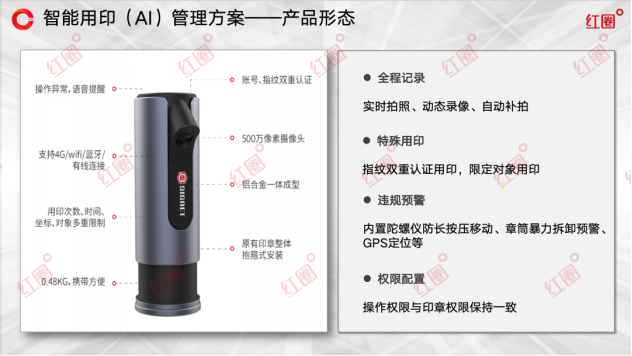 為解決上述痛點(diǎn),紅圈構(gòu)建了“AI智能核驗(yàn)、全流程數(shù)字化、智能硬件保障、全場(chǎng)景覆蓋”四位一體的全方位用印風(fēng)控體系。