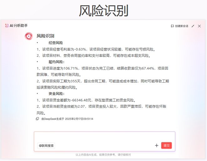 → AI風險預警:智能預警現(xiàn)金流缺口,提前籌措防斷裂(例:精準定位需籌款項目)