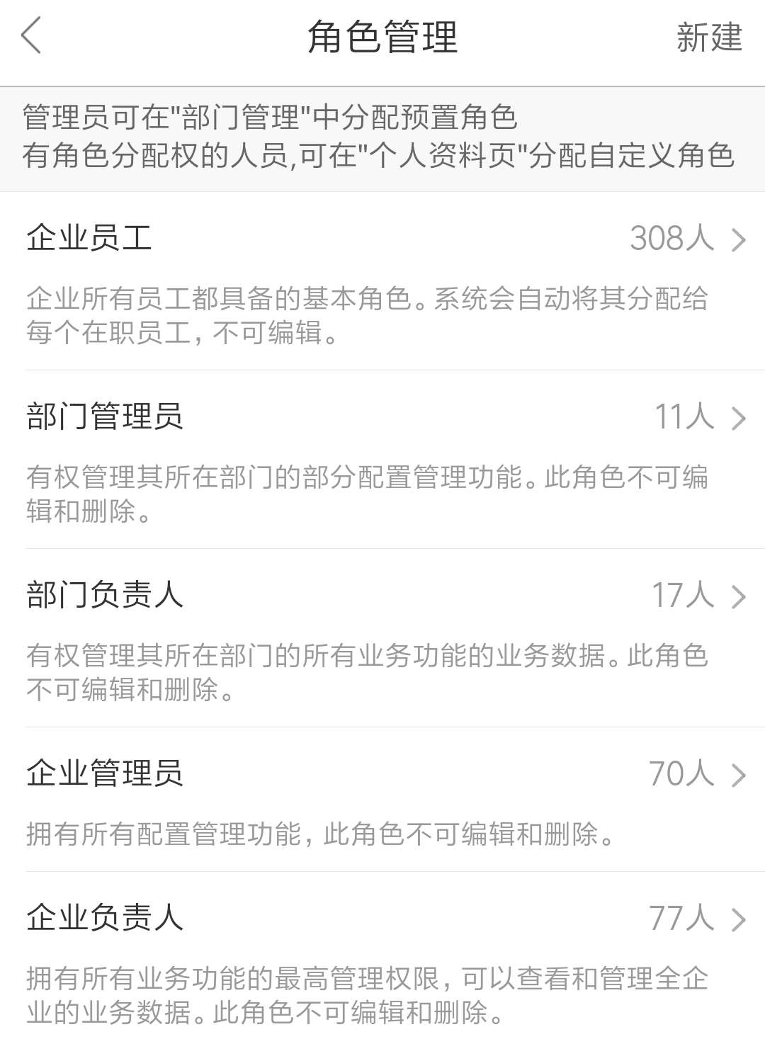 在角色管理中,會默認(rèn)有五種角色:企業(yè)負(fù)責(zé)人、企業(yè)管理員、部門負(fù)責(zé)人、部門管理員、企業(yè)員工。